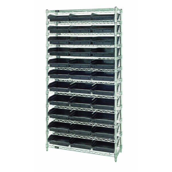 Bin Wire Shelving System, 36''W x 12''D x 74''H overall size, 800 lb. capacity per shelf, includes: 12 wire shelves, 4 posts, and 33 QSB109 black bins, chrome plated finish