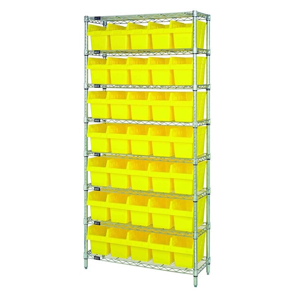 Bin Wire Shelving System, 36''W x 24''D x 74''H overall size, 800 lb. capacity per shelf, includes: 8 wire shelves, 4 posts, and 35 QSB806 yellow bins, chrome plated finish