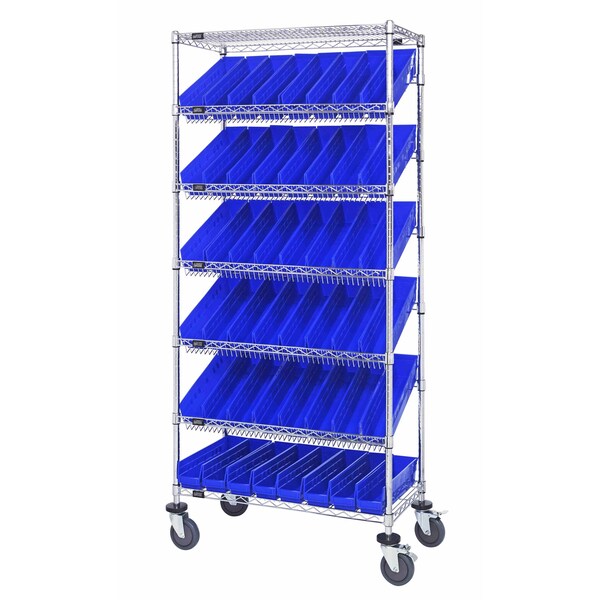 Bin Systems Unit, mobile, 36''L x 18''W x 80''H, includes: 4 posts, 2 flat wire shelves, 5 slanted wire shelves, 48 17-7/8''L x 4-1/8''W x 4''H blue bins QSB103 & 4 5'' swivel polyurethane casters 2 with brakes, chrome plated finish, suitable for dry storage applications, shipped KD