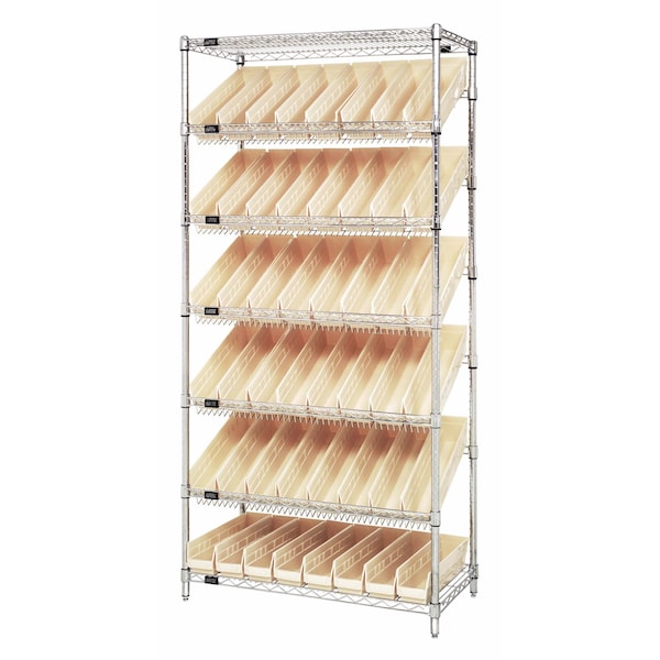 Bin Systems Unit, stationary, 36''W x 18''D x 74''H, includes: 2 flat wire shelves, 5 slanted wire shelves, 4 posts, and 48 17-7/8''W x 4-1/8''D x 4''H ivory bins QSB103, chrome plated finish, NSF, shipped KD