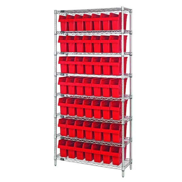 Bin Wire Shelving System, 36''W x 24''D x 74''H overall size, 800 lb. capacity per shelf, includes: 8 wire shelves, 4 posts, and 49 QSB805 red bins, chrome plated finish