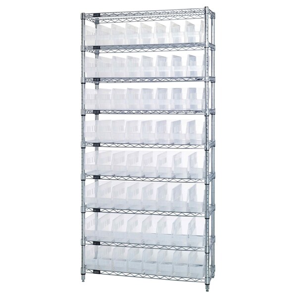 Bin Wire Shelving System, 36''W x 24''D x 74''H overall size, 800 lb. capacity per shelf, includes: 9 wire shelves, 4 posts, and 64 QSB205 clear bins, chrome plated finish