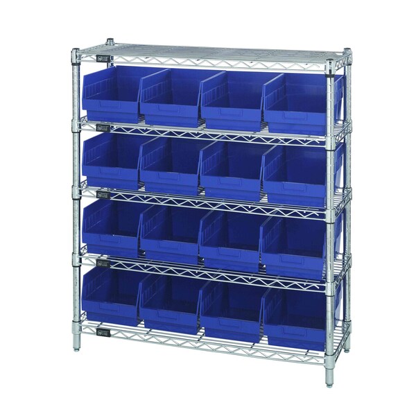 Bin Wire Shelving Center, 12''D x 36''W x 39''H, 800 lbs capacity per shelf, includes: 5 shelves and 16 QSB207 blue bins, chrome plated finish, shipped KD
