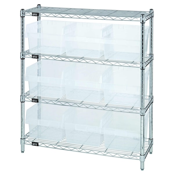 Bin Wire Shelving Center, 12''D x 36''W x 39''H, 800 lbs capacity per shelf, includes: 4 shelves and 9 QSB809 clear bins, chrome plated finish, shipped KD