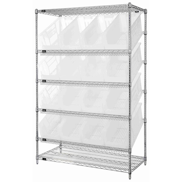 Bin System Unit, stationary, 24''W x 48''L x 74''H, 800 lbs capacity per shelf, includes: 2 flat and 4 slanted shelves, 4 posts and 16 QUS953 clear bins, chrome plated finish, shipped KD