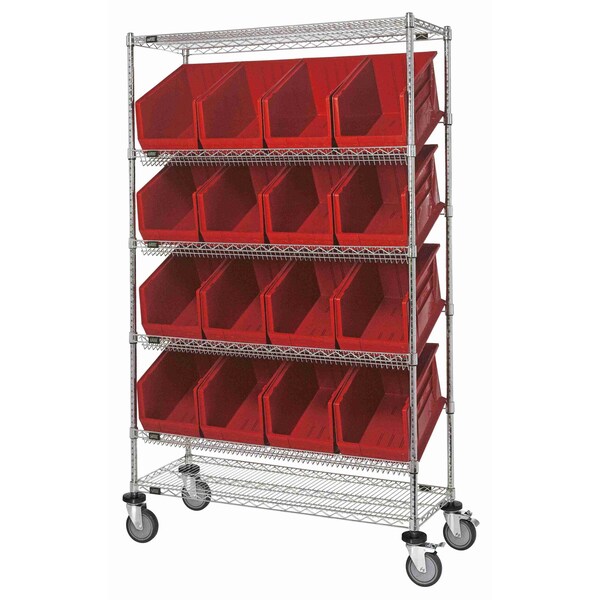 Slanted Shelf Cart, 48''W x 18''D x 80''H, 1200 lbs load capacity, includes: 2 flat and 4 slanted shelves, and 16 QUS260 red bins, chrome plated finish, shipped KD