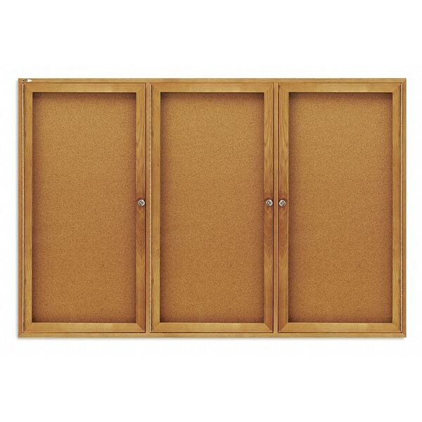 Enclosed Bulletin Board, Push-Pin, Board Material Cork, Width 72 in, Height 48 in, Frame Color Light Oak, Board Color Natural, Number of Doors 3, Door Type Swing, Includes Tamperproof Lock, 1 Key per Lock, Mounting hardware