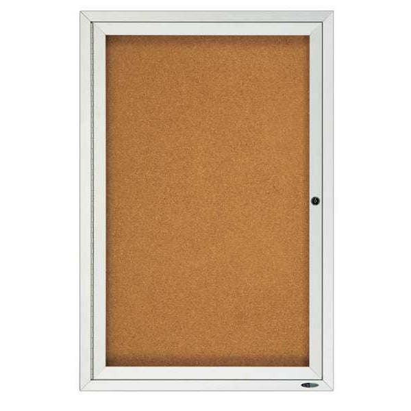 Enclosed Bulletin Board, Push-Pin, Board Material Cork, Width 24 in, Height 36 in, Board Frame Material Aluminum, Frame Color Silver, Board Color Natural, Number of Doors 1, Door Type Swing, Includes (2) Keys per Lock, Mounting Hardware, Tamperproof Lock, Mounting/Mobility Type Wall Mounted, Door Material Acrylic, Indoor Enclosed Bulletin Board