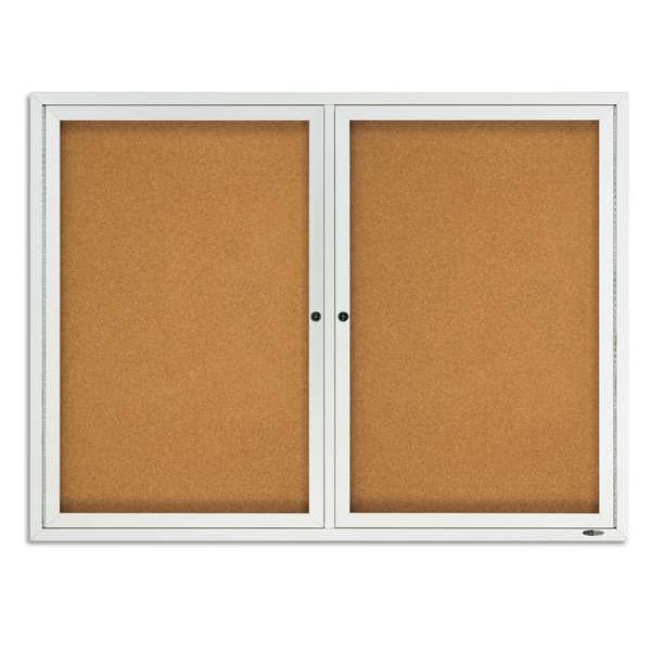 Enclosed Bulletin Board, Push-Pin, Board Material Cork, Width 48 in, Height 36 in, Board Frame Material Aluminum, Frame Color Silver, Board Color Natural, Number of Doors 2, Door Type Swing, Includes (2) Keys per Lock, Mounting Hardware, Tamperproof Lock, Mounting/Mobility Type Wall Mounted, Door Material Acrylic, Indoor Enclosed Bulletin Board