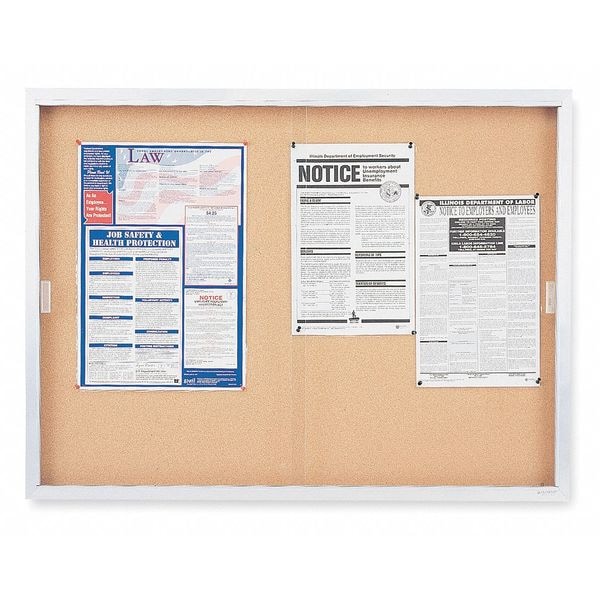 Enclosed Bulletin Board, Push-Pin, Board Material Cork, Width 72 in, Height 48 in, Board Frame Material Aluminum, Frame Color Gray, Board Color Natural, Number of Doors 2, Door Type Sliding, Includes Key, Lock, Mounting/Mobility Type Wall Mounted, Door Material Glass, Indoor Enclosed Bulletin Board