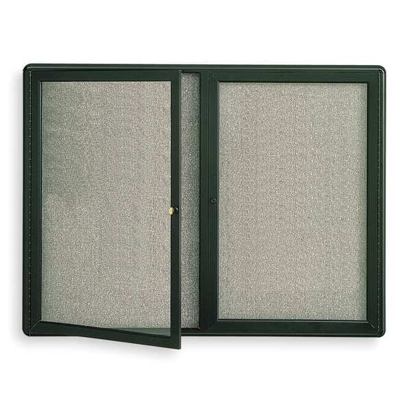 Enclosed Bulletin Board, Letter Board, Board Material Fabric, Width 48 in, Height 36 in, Board Frame Material Fiberboard, Frame Color Gray, Board Color Gray, Number of Doors 2, Door Type Swing, Includes Key, Mounting/Mobility Type Wall Mounted, Door Material Acrylic, Indoor Enclosed Bulletin Board