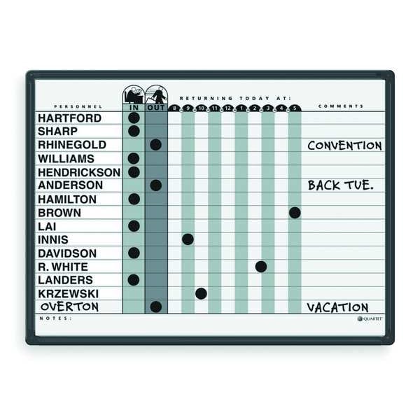 In/Out Board, Board Properties Magnetic, Mounting/Mobility Type Wall Mounted, Board Color White/Gray, Dry Erase Height 18 in, Dry Erase Width 24 in, Dry Erase Surface Finish Gloss, Frame Color Black, Board Frame Material Aluminum, Frame Material Aluminum, Dry Erase Surface Type Porcelain, Corner Shape Rounded, Includes Magnets, Hardware, Marker