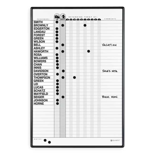 In/Out Board, Board Properties Magnetic, Mounting/Mobility Type Wall Mounted, Board Color White/Gray, Dry Erase Height 36 in, Dry Erase Width 24 in, Dry Erase Surface Finish Gloss, Frame Color Black, Board Frame Material Aluminum, Frame Material Aluminum, Dry Erase Surface Type Porcelain, Corner Shape Rounded, Includes Magnets, Hardware, Marker