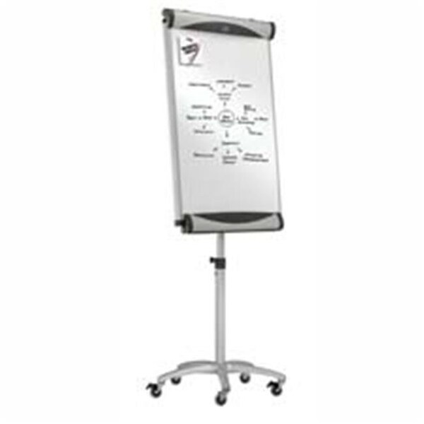 Mobile easel features a magnetic porcelain surface and brushed silver frame. DuraMax Porcelain will not scratch or dent, and the Total Erase surface will not stain or ghost. The steel-backed porcelain creates a magnetic surface that doubles as a bulletin board. Easel features an accessory tray and five-star base with two locking casters. Adjustable flip chart pad holder accommodates all pads. Board surface measures 27" x 41".