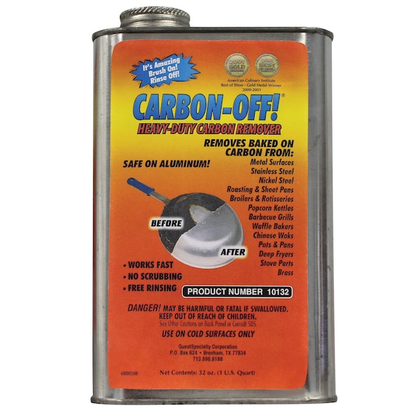 CARBON-OFF! is a powerful gel that dis_x0002_solves carbon buildup from metal surfaces. Spray or brush on, let set 15 minutes to overnight, depending on the amount of buildup to be removed, then rinse under cold water with a brush or scrubbing pad. Also available in a dip tank solu_x0002_tion for repeated treatment of multiple utensils. CARBON-OFF! works quickly and easily saving time and labor. Do not use on or place appliance to be cleaned on painted surfaces, plastics, acryl_x0002_ics, corian sinks and counter tops, anolon surfaces, calphalon or teflon non-stick pans. SAFE ON ALUMINUM. REMOVES BAKED ON CARBON FROM: Metal Surfaces. Brass. Stainless Steel. Broilers. Nickel Steel. Deep Fryers. Stove Parts. Rotisseries. Barbecue Grills. Roasting & Sheet Pans. Pots & Pans