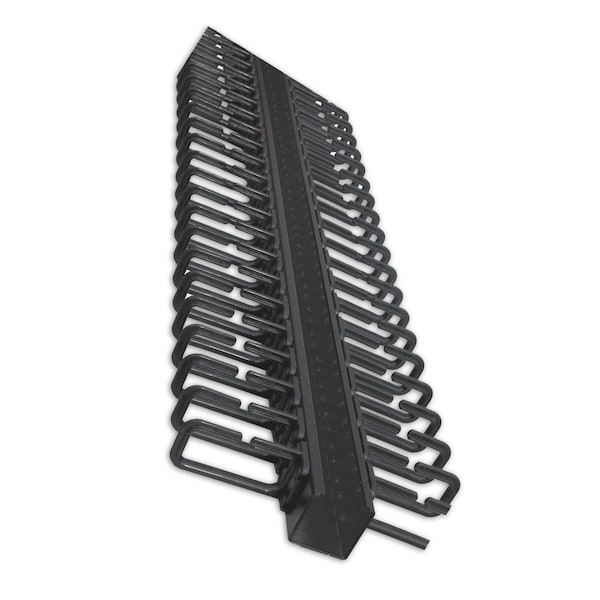 This Vertical Cable Manager was designed for use with Quest 6ft. & 7ft. floor enclosures. It is constructed of a steel mounting plate with high resistant nylon rings, has a cable capacity of up to 100 cables, 50 on each side, and comes complete with mounting hardware. These cable managers have a black microfinish to match our rack color.