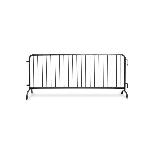 These barricades are built from heavy duty 16 gauge steel and are powder coated for long-term weather resistance. Frames are made from 1.5 38mm diameter steel tubing, while uprights are made from 1/2 steel tubing. 21 closely space uprights are used for maximum rigidity and these are fully inserted into the frame before welding, providing extraordinary strength. This model features bridge feet bases for use on smooth surfaces such as tarmac and where pedestrian traffic demands the minimum trip hazard. The barricades interlock using the industry standard hook and half-loop fastening system.