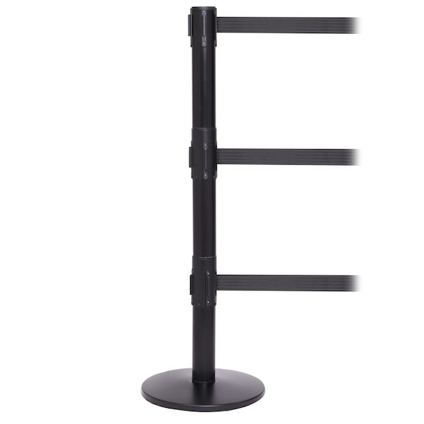 The QueuePro Triple 250 is the world’s first triple belt barrier, designed to provide the maximum control of pedestrian flow. The lower belts stop pedestrians from ducking under the belt, keep children in line and provide guidance for the visually impaired using a cane. The bottom belts make this stanchion ADA (Americans with Disabilities Act) compliant. The lower belt cassettes are easily replaced in the field due to our unique 3 piece post construction. QueuePro stanchions offer the durability of steel construction and a heavy-duty cast iron base. The long service life of these stanchions makes them ideal for high traffic areas or where the stanchions are moved frequently. All QueuePro stanchion models feature a braking system for slow, safe belt retraction and a locking belt end to prevent accidental release. A full circumference floor protector to prevent floor damage is standard. QueuePros’s 4-way connectivity allows belts from three other stanchions to be connected in line or at right angles so complex queue systems can be created.