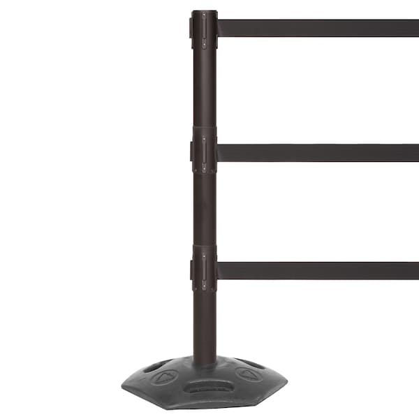 The three belts of the WeatherMaster Triple ensure pedestrians cannot duck under or through the belts providing maximum perimeter security for work or manufacturing areas. This stanchion provides a lower cost, more flexible option for perimeter security than using rigid barriers or solid panels. The bottom belts make this stanchion ADA (Americans with Disabilities Act) compliant. WeatherMaster Triple is designed for restricting access in tough working environments. Manufactured with a stainless-steel post and a heavy-duty rubber base there is nothing to rust making this barrier ideal for outdoors use. The base features convenient carry handles, a curved design to reduce trip hazard and is and is tough enough to drive over. All WeatherMaster models feature a braking system for slow, safe belt retraction and a locking belt end to prevent accidental release.