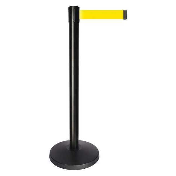 Barrier Post with Belt, Maximum Overall Height 40 in, Legend No Legend, Legend Color Not Applicable, Number of Belts 1, Belt Length 10 ft, Belt Width 2 in, Belt Color Yellow, Belt Pattern No Pattern, Post Color Black, Product Type Stanchion, Includes Universal Cassette Clip, Minimum Overall Height Not Applicable, Post Diameter 2 1/2 in, Post Material Metal Alloy, Post Finish Powder Coated, Base Type Basic, Base Diameter 14 in, Base Material ABS, Base Finish Powder Coated, ADA Compliance No