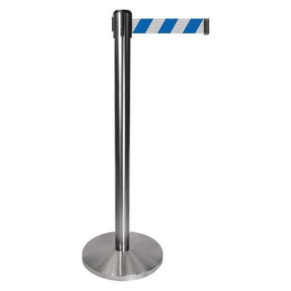 Barrier Post with Belt, Maximum Overall Height 40 in, Legend No Legend, Legend Color Not Applicable, Number of Belts 1, Belt Length 10 ft, Belt Width 2 in, Belt Color Blue, Belt Pattern Chevron, Product Type Stanchion, Includes Universal Cassette Clip, Minimum Overall Height Not Applicable, Post Diameter 2 1/2 in, Post Material Metal Alloy, Post Finish Satin Chrome, Base Type Basic, Base Diameter 14 in, Base Material Metal Alloy, Base Finish Satin Chrome, ADA Compliance No