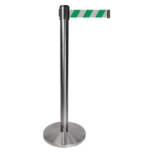 Barrier Post with Belt, Maximum Overall Height 40 in, Legend No Legend, Legend Color Not Applicable, Number of Belts 1, Belt Length 10 ft, Belt Width 2 in, Belt Color Green, Belt Pattern Chevron, Product Type Stanchion, Includes Universal Cassette Clip, Minimum Overall Height Not Applicable, Post Diameter 2 1/2 in, Post Material Metal Alloy, Post Finish Satin Chrome, Base Type Basic, Base Diameter 14 in, Base Material Metal Alloy, Base Finish Satin Chrome, ADA Compliance No