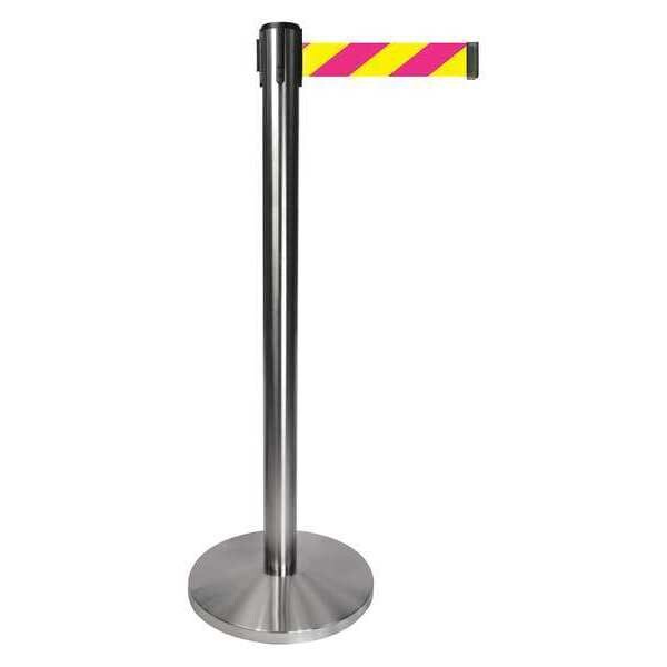 Barrier Post with Belt, Maximum Overall Height 40 in, Legend No Legend, Legend Color Not Applicable, Number of Belts 1, Belt Length 10 ft, Belt Width 2 in, Belt Color Magenta/Yellow, Belt Pattern Chevron, Product Type Stanchion, Includes Universal Cassette Clip, Minimum Overall Height Not Applicable, Post Diameter 2 1/2 in, Post Material Metal Alloy, Post Finish Satin Chrome, Base Type Basic, Base Diameter 14 in, Base Material Metal Alloy, Base Finish Satin Chrome, ADA Compliance No