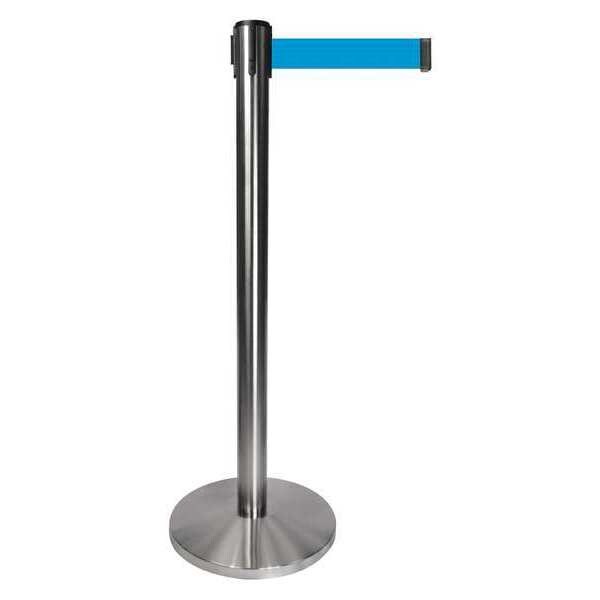 Barrier Post with Belt, Maximum Overall Height 40 in, Legend No Legend, Legend Color Not Applicable, Number of Belts 1, Belt Length 10 ft, Belt Width 2 in, Belt Color Light Blue, Belt Pattern No Pattern, Product Type Stanchion, Includes Universal Cassette Clip, Minimum Overall Height Not Applicable, Post Diameter 2 1/2 in, Post Material Metal Alloy, Post Finish Satin Chrome, Base Type Basic, Base Diameter 14 in, Base Material Metal Alloy, Base Finish Satin Chrome, ADA Compliance No