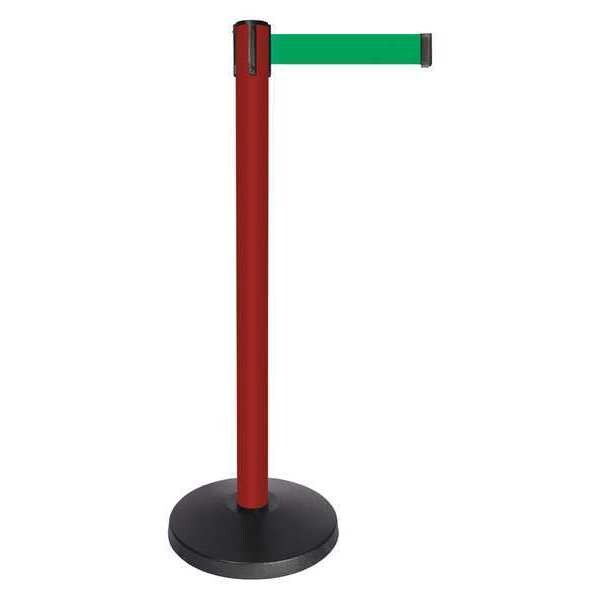 Barrier Post with Belt, Maximum Overall Height 40 in, Legend No Legend, Legend Color Not Applicable, Number of Belts 1, Belt Length 10 ft, Belt Width 2 in, Belt Color Green, Belt Pattern No Pattern, Post Color Red, Product Type Stanchion, Includes Universal Cassette Clip, Minimum Overall Height Not Applicable, Post Diameter 2 1/2 in, Post Material Metal Alloy, Post Finish Powder Coated, Base Type Basic, Base Diameter 14 in, Base Material ABS, Base Finish Powder Coated, ADA Compliance No