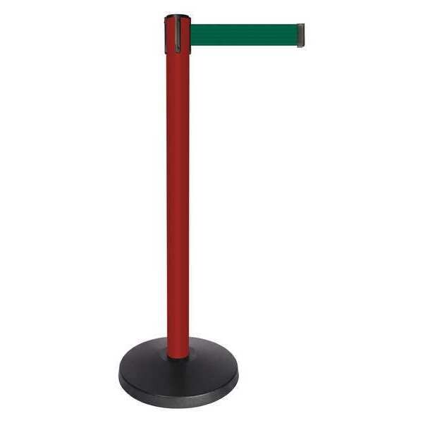 Barrier Post with Belt, Maximum Overall Height 40 in, Legend No Legend, Legend Color Not Applicable, Number of Belts 1, Belt Length 10 ft, Belt Width 2 in, Belt Color Dark Green, Belt Pattern No Pattern, Post Color Red, Product Type Stanchion, Includes Universal Cassette Clip, Minimum Overall Height Not Applicable, Post Diameter 2 1/2 in, Post Material Metal Alloy, Post Finish Powder Coated, Base Type Basic, Base Diameter 14 in, Base Material ABS, Base Finish Powder Coated, ADA Compliance No
