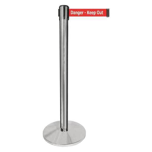 Barrier Post with Belt, Silver, 10 ft Length, 40 in Post Height, Danger Keep Out, Polished chrome