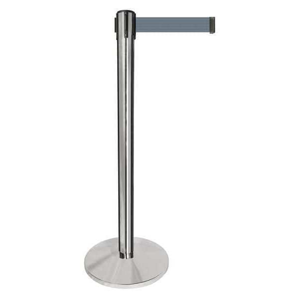 Barrier Post with Belt, Maximum Overall Height 40 in, Legend No Legend, Legend Color Not Applicable, Number of Belts 1, Belt Length 10 ft, Belt Width 2 in, Belt Color Gray, Belt Pattern No Pattern, Product Type Stanchion, Includes Universal Cassette Clip, Minimum Overall Height Not Applicable, Post Diameter 2 1/2 in, Post Material Metal Alloy, Post Finish Polished Chrome, Base Type Basic, Base Diameter 14 in, Base Material Metal Alloy, Base Finish Polished Chrome, ADA Compliance No