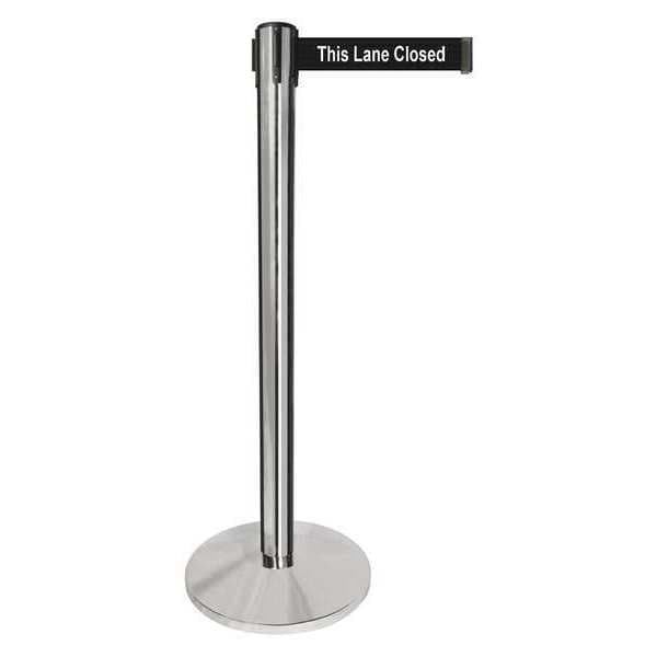 Barrier Post with Belt, Maximum Overall Height 40 in, Legend This Lane Closed, Legend Color White, Number of Belts 1, Belt Length 10 ft, Belt Width 2 in, Belt Color Black, Belt Pattern No Pattern, Post Color Gray, Product Type Stanchion, Includes Universal Cassette Clip, Minimum Overall Height Not Applicable, Post Diameter 2 1/2 in, Post Material Metal Alloy, Post Finish Polished Chrome, Base Type Basic, Base Diameter 14 in, Base Material Metal Alloy, Base Finish Polished Chrome