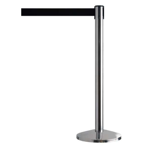 Barrier Post with Belt, Maximum Overall Height 40 in, Legend No Legend, Legend Color Not Applicable, Number of Belts 1, Belt Length 7 1/2 ft, Belt Width 2 in, Belt Color Black, Belt Pattern No Pattern, Post Color Silver, Product Type Stanchion, Minimum Overall Height Not Applicable, Post Diameter 2 1/2 in, Post Material Metal Alloy, Post Finish Polished Chrome, Base Type Standard, Base Diameter 14 in, Base Material Steel, Base Finish Polished Chrome, ADA Compliance No