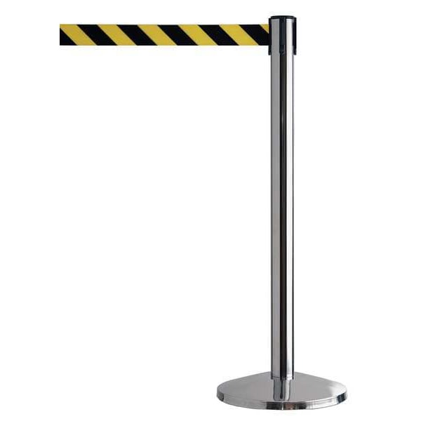 Barrier Post with Belt, Maximum Overall Height 40 in, Legend No Legend, Legend Color Not Applicable, Number of Belts 1, Belt Length 7 1/2 ft, Belt Width 2 in, Belt Color Black/Yellow, Belt Pattern Chevron, Product Type Stanchion, Minimum Overall Height Not Applicable, Post Diameter 2 1/2 in, Post Material Metal Alloy, Post Finish Polished Chrome, Base Type Standard, Base Diameter 14 in, Base Material Steel, Base Finish Polished Chrome, ADA Compliance No, Height Adjustability Fixed Height
