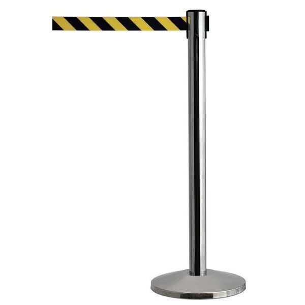 Barrier Post with Belt, Maximum Overall Height 40 in, Legend No Legend, Legend Color Not Applicable, Number of Belts 1, Belt Length 7 1/2 ft, Belt Width 2 in, Belt Color Black/Yellow, Belt Pattern Chevron, Product Type Stanchion, Minimum Overall Height Not Applicable, Post Diameter 2 1/2 in, Post Material Metal Alloy, Post Finish Satin Stainless Steel, Base Type Standard, Base Diameter 14 in, Base Material Stainless Steel, Base Finish Satin Stainless Steel, ADA Compliance No