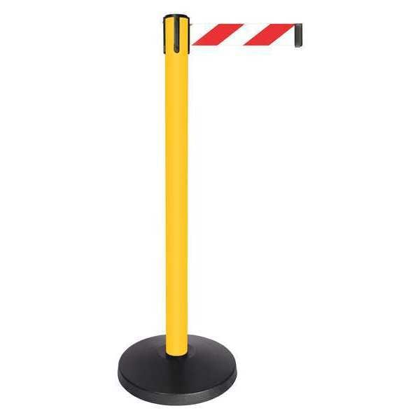 Barrier Post with Belt, Maximum Overall Height 40 in, Legend No Legend, Legend Color Not Applicable, Number of Belts 1, Belt Length 10 ft, Belt Width 2 in, Belt Color Red, Belt Pattern Chevron, Post Color Yellow, Product Type Stanchion, Includes Universal Cassette Clip, Minimum Overall Height Not Applicable, Post Diameter 2 1/2 in, Post Material Metal Alloy, Post Finish Powder Coated, Base Type Basic, Base Diameter 14 in, Base Material ABS, Base Finish Powder Coated, ADA Compliance No