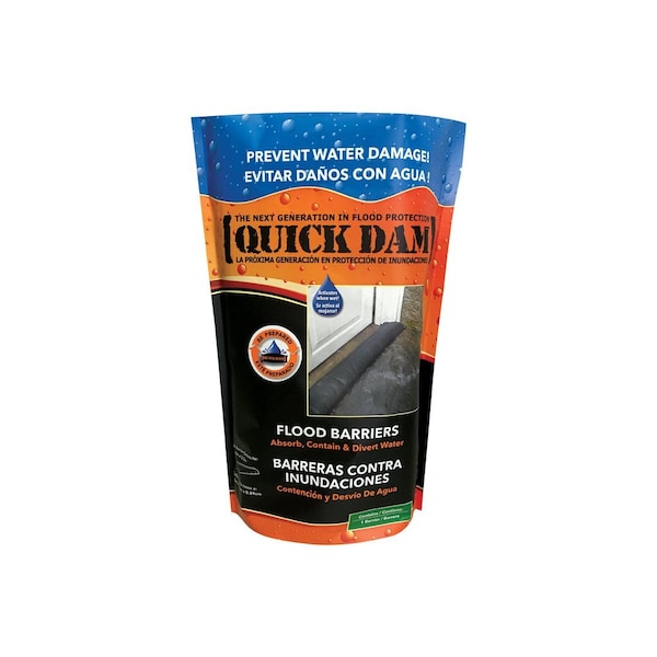 Quick Dam Flood Barrier absorbs, contains and diverts problem flood water. Activate when wet with no sand needed. The inner absorbent turns to gel and creates a barrier that blocks and diverts additional water. Grows to full 3-1/2 inch high in minutes. Can be stacked like a pyramid as needed. Attached smaller wedge prevents barrier from rolling out of position. Compact, lightweight. and quick and easy to deploy. No more filling sandbags. Leave in place for months of ongoing protection. Not for use with salt water. Use for flood control, erosion control, ballistic protection, water removers, ballasts and more.