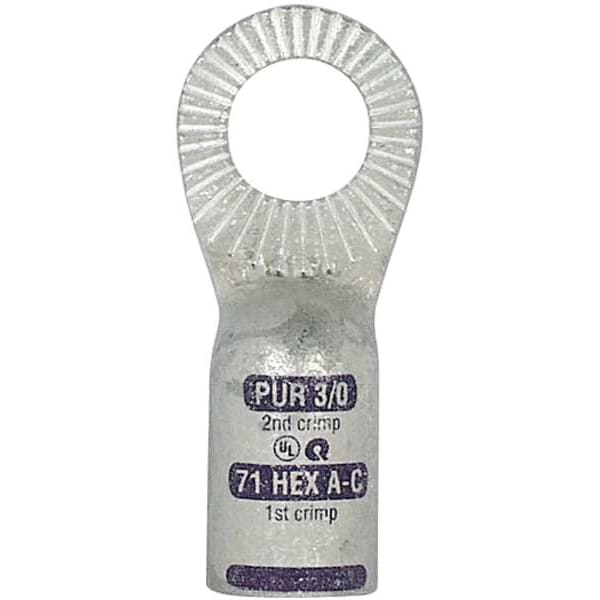 One-Hole Lug Compression Connector, Lug Type Locking Lug, Connection Type Crimp, Contact Material Tin Plated Copper, Gauge 3/0 ga, Color Code Purple, Stud Size 1/2 in, Shape Straight, Raised Pads Yes, Standards cULus, RoHs