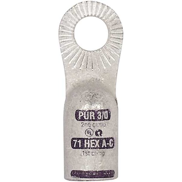 One-Hole Lug Compression Connector, Lug Type Locking Lug, Connection Type Crimp, Contact Material Tin Plated Copper, Gauge 3/0 ga, Color Code Purple, Stud Size 3/8 in, Shape Straight, Raised Pads Yes, Standards cULus, RoHs