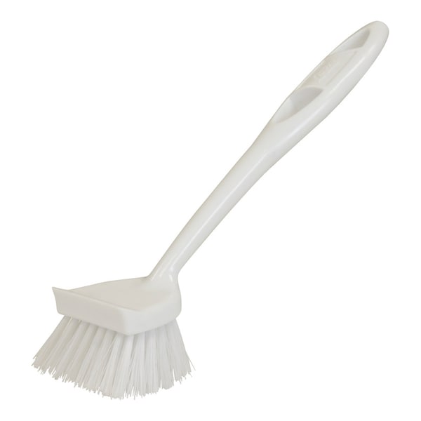 Take the chore out of dish washing with this all-purpose brush. Made of polypropylene fiber this brush is long lasting rinses clean and won’t scratch. It also features a handy scraper for tackling baked on foods. A convenient hang-up feature makes this tool easy to store.