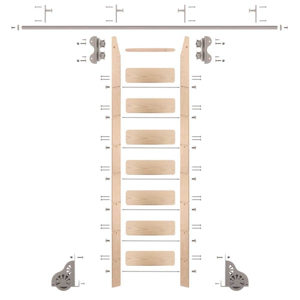 • Ladder package includes: 1 standard roller hardware kit, one 8 ft. Maple ladder, one 8 ft. rail, 2 rail end caps, 4 vertical rail brackets and required fasteners