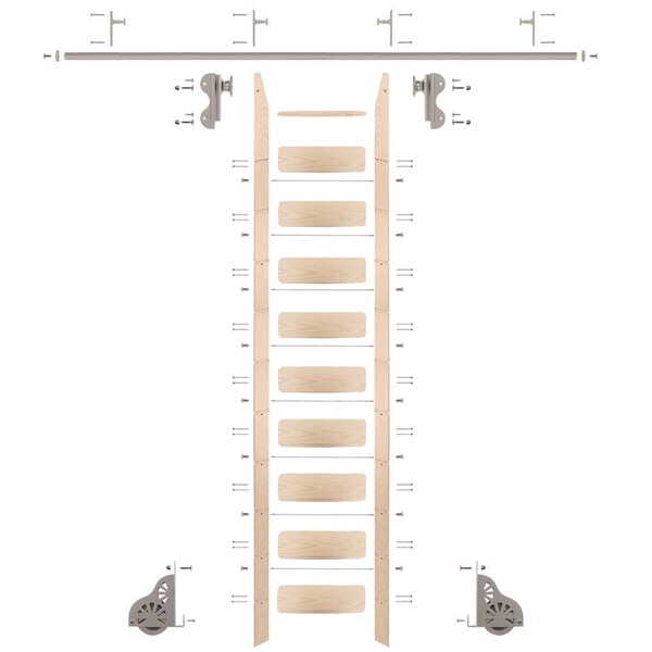 • Ladder package includes: 1 Hook roller hardware kit, one 10 ft. Maple ladder, one 8 ft. rail, 2 rail end caps, 4 vertical hook rail brackets and required fasteners