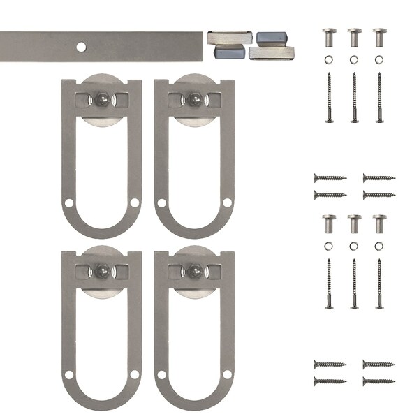 • Hardware includes: (4) Roller door hangers, (2) rail end stops, (1) steel rail, and necessary fasteners, no bottom guides, varies on application