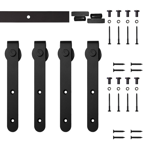 • Hardware includes: (4) Roller door hangers, (2) rail end stops, (1) steel rail, and necessary fasteners, no bottom guides, varies on application