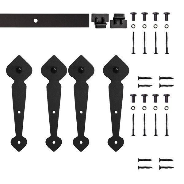 • Hardware includes: (4) Roller door hangers, (2) rail end stops, (1) steel rail, and necessary fasteners, no bottom guides, varies on application