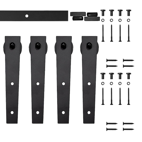• Hardware includes: (4) Roller door hangers, (2) rail end stops, (1) steel rail, and necessary fasteners, no bottom guides, varies on application