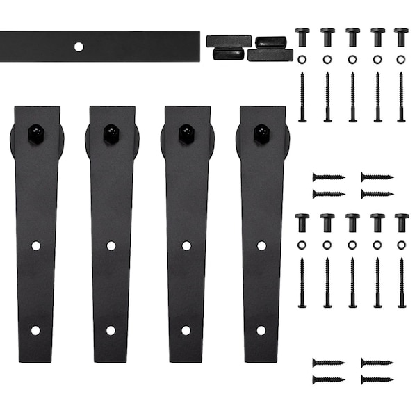 • Hardware includes: (4) Roller door hangers, (2) rail end stops, (1) steel rail, and necessary fasteners, no bottom guides, varies on application