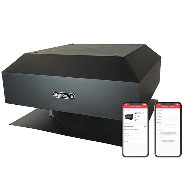 Attic Exhaust Fan, Control Type Smart Control Hub, Blade Material Steel, Exhaust Airflow @ 0.000 in SP 2,116 cfm, Base Material Steel, Fire Safety Shut-Off Yes, High-Efficiency Motor Yes, Housing Material Steel, Includes Humidistat No, Includes Shutter No, Includes Thermostat Yes, Maximum Attic Area 3,000 sq ft, Motor Horsepower Not Applicable, Mounting Location Roof, Nameplate Voltage 120V AC, Overall Diameter 16 1/2 in, Overall Height 14 in, Overall Length 24 in, Overall Width 24 in
