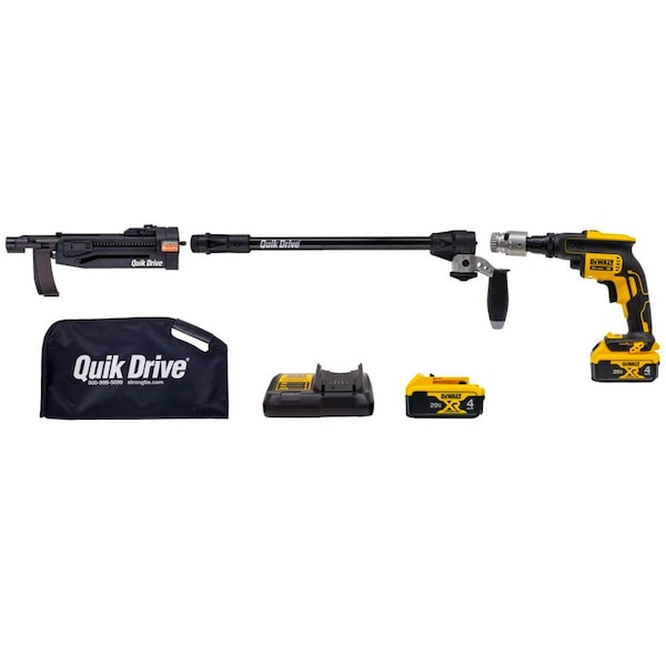 Simpson Strong-Tie PRO200SG2C2K QuikDrive Cordless Multi-Purpose System, 2000 RPM DeWalt 20VThe Quik Drive PRO200SG2 Cordless Multi-Purpose System is a complete auto-feed screw driving tool powered by a 2000 rpm, 20V cordless DeWalt brushless driver motor with adjustable torque. Eliminate the need for cords, compressors and generators to run with this best-in-class, ergonomic fastening system. Subfloor installations are fast and easy using this light Weight , portable Quik Drive system. The cordless DeWalt driver and light Weight extension allow stand-up driving, making for a fast, ergonomic and less fatiguing installation.Quik Drive cordless combined with Simpson Strong-Tie low-torque fasteners, drives more screws, faster, per battery charge.Efficient: Slash the setup time. Eliminate cord and hose maintenance and tangle. Reduce tripping and electrical shock hazards.Complete: Includes two 4.0,amp hour lithium-ion batteries and charger.The PRO200SG2 requires less skill training than traditional installation methods, allowing a first-day apprentice to keep pace with a seasoned veteran.Quik Drive Cordless PRO200SG2 Multi-Purpose System can be used with or without the light Weight extension.Key FeaturesPrecise, self-locking depth adjustment for consistent fastener drive depthLight Weight G3 extension for better ergonomicsPowerful DeWalt cordless driver motorThe patented curved collation strips US Patent 7,051,875 hold the screws up and away from the work surface, making moving and positioning the tool easierThe collated strips are also pointed on the inserted end to simplify loading>ApplicationsFastening Wood-to-WoodFastening Subfloor to WoodFastening Wood to Steel: SheathingUnderlayment / BackerboardFastening Fiber-Cement SidingCold-Formed Steel